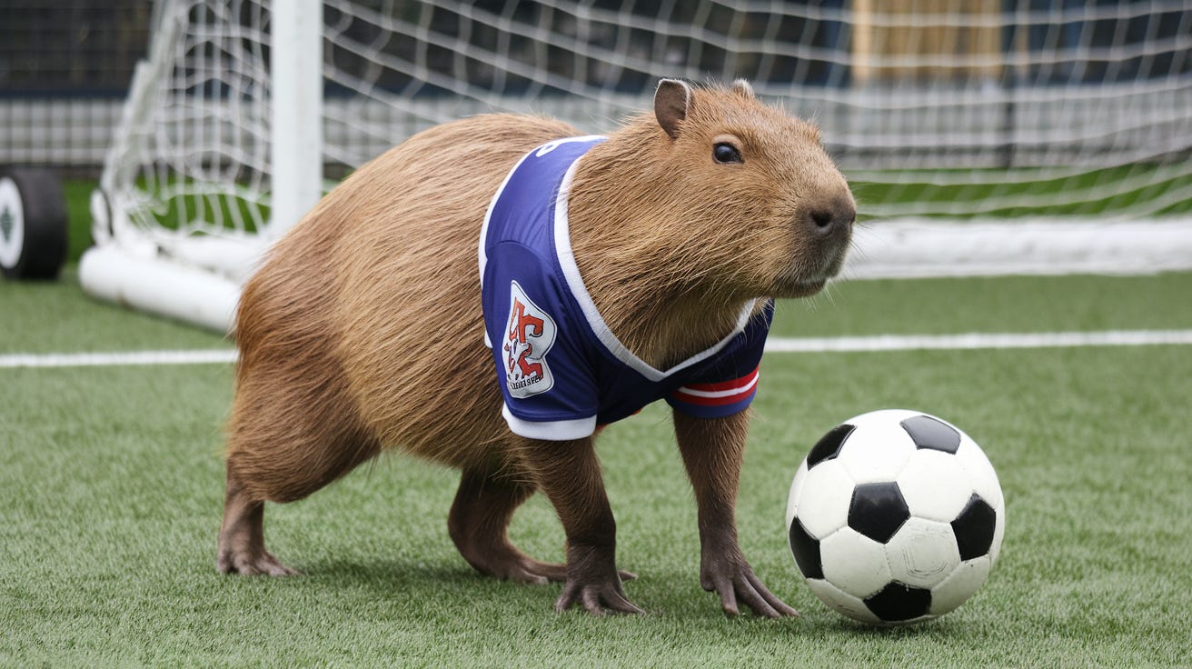 E bom, agora que você entendeu a situação, será que a foto de capa dessa edição da capivara jogando futebol é real, ou é feita por IA?